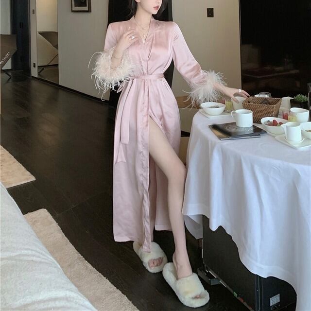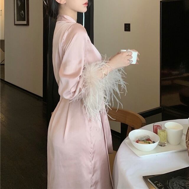 優しい肌心地と上品さを引き立ててくれるアイスシルク素材のルームウェアです。お色は写真のような淡いピンクカラー。ローブのお袖は女らしさを引き立ててくれるフェザーをつけております。他ルームウェアとの組み合わせもOK。着回しもできるから、おうち時間がより楽しめますね。